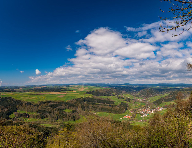 Stühlingen, direkt an der Schweizer Grenze, bildet den Startpunkt der 119 km langen Wandertour. Ein Blick zum Schloss Hohenlupfen, dem Wahrzeichen der Stadt, sollte man sich schon gönnen, ehe man von den verschiedensten Landschaftseindrücken in den Bann gezogen wird. Von Stühlingen aus geht es direkt am Ufer der Wutach entlang bis nach Weizen. Hier liegt der Talbahnhof der berühmten „Sauschwänzlebahn“. Das Pfeifen der Dampflok bekommt man während dieser Etappe nach Blumberg noch das ein oder andere Mal zu hören. Auf bequemen Waldwegen geht es weiter bis zur Museumsbahnhaltestelle Lausheim-Blumegg. Dort empfiehlt sich ein kurzer Abstecher zur Museumsmühle Weiler (3 Mühlräder, 7 Mahl- und Stampfwerke), bevor es weiter , in den unteren Teil der Wutachschlucht, in die Wutachflühen, geht. Die Wutachflühen (Flühen = Felsen) stehen für steil aufragende Felstürme, gigantische Farne, bemooste Steine und knorrige Wurzeln. Diesen „Urwaldabschnitt“ des Südschwarzwalds passiert man auf teils etwas ausgesetzten schmalen Pfaden. Am Schluss des Flühewegs gibt’s noch einmal einen tollen Tiefblick, später eine Rastmöglichkeit an der Bielwasenhütte. Weiter verläuft der jetzt bequeme Weg bergwärts und mit etwas Glück sieht man auch den Museumsdampfzug, der sich in weiten Kehren bergwärts windet. Bald säumen schattenspendende Bäume den Aufstieg bis zum Aussichtspunkt Buchberg (876m). Am Rastplatz kann man sowohl einen letzten Blick auf die zurückliegenden Wutachflühen, als auch einen Blick auf die Wanderstrecke des nächsten Tages werfen. Danach sind auch die letzten Etappenkilometer bis Blumberg ein Kinderspiel.