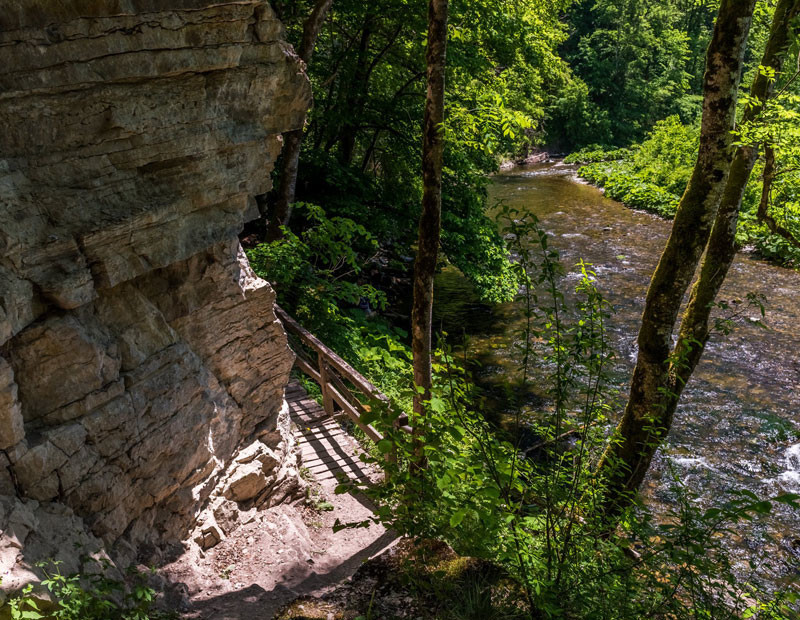 Gemütliche Talauen, schmale, teils felsige Steige mit Leitern und Treppen an senkrechten Felswänden, Felsgalerien, Pfade direkt am Wasser